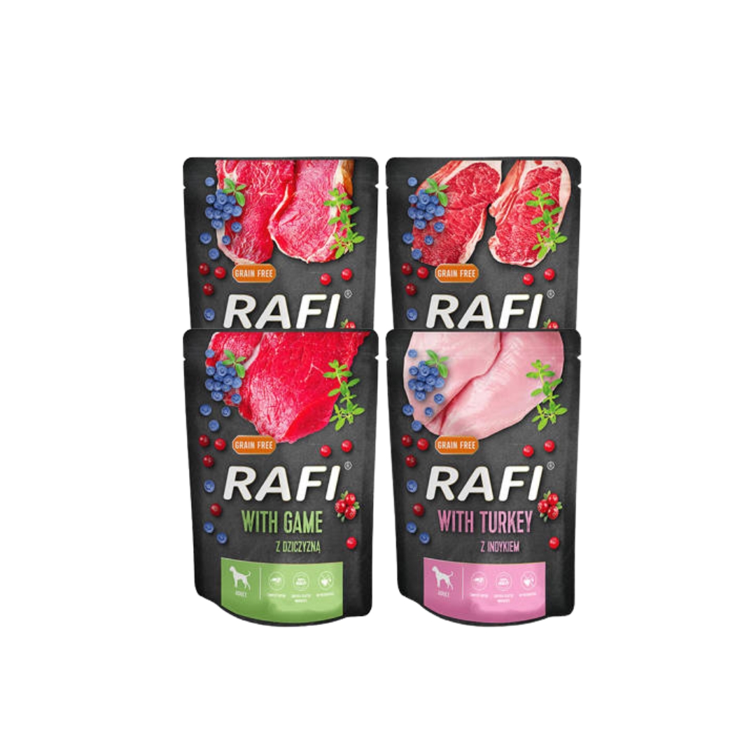 Wybierz Rafi MIX w saszetkach, aby codziennie dostarczać swojemu psu pełnowartościowych posiłków, które wspierają jego zdrowie i samopoczucie. Dzięki różnorodnym smakom i wysokiej jakości składnikom, każdy posiłek będzie dla Twojego pupila prawdziwą przyjemnością.